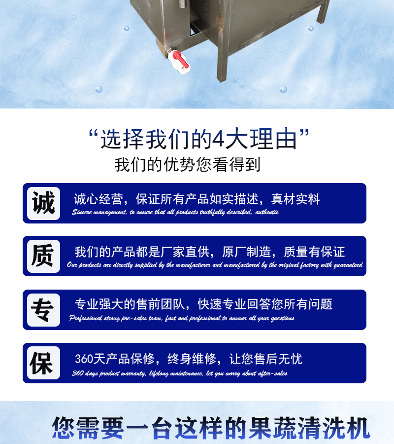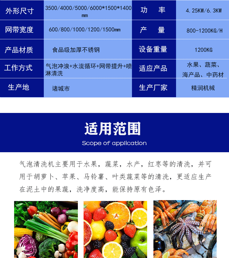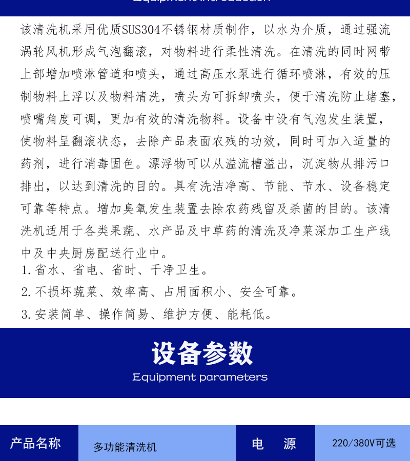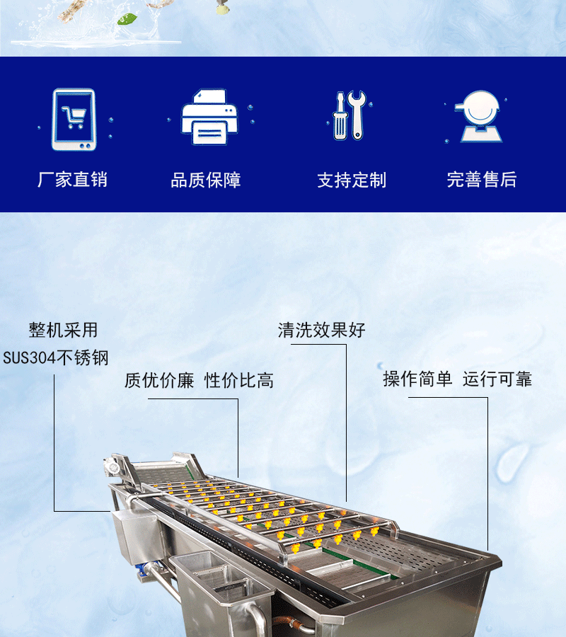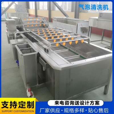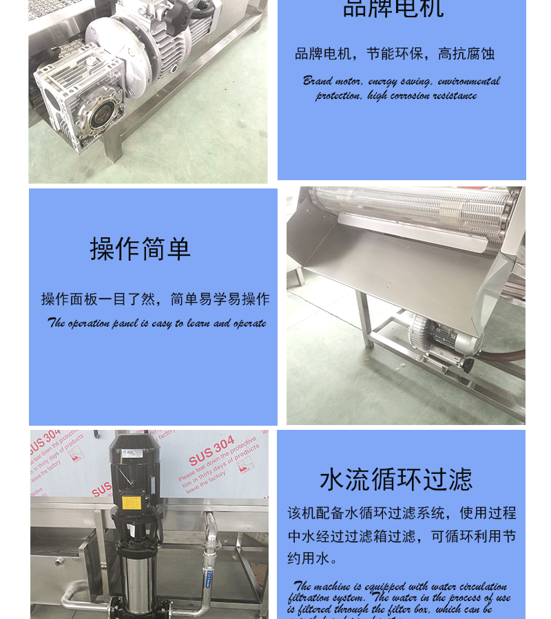 1、設備除電機、軸承等標準件外均采用不銹鋼SUS304/2B材料制作,完全符合出口食品衛生要求。設備中設有氣泡發生裝置,使物料呈翻滾狀態,具有洗潔凈高、節能、節水、設備穩定可靠等特點。