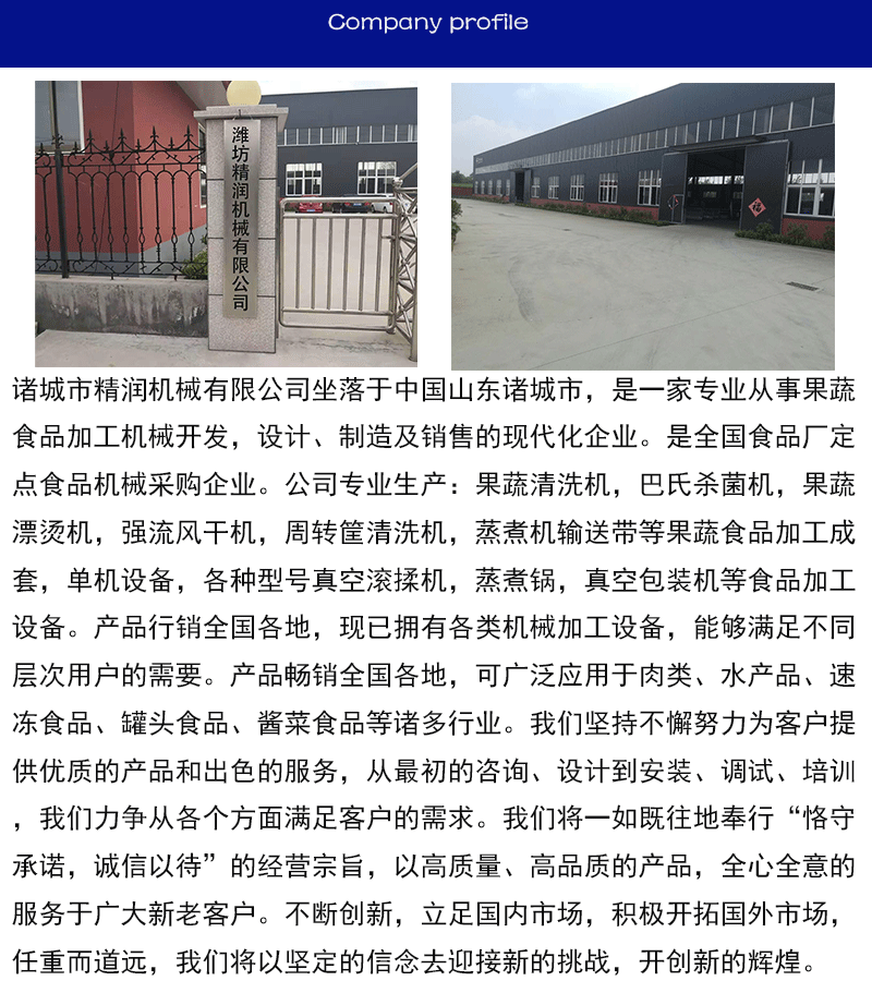 諸城市精潤機械專業生產各種蔬菜瓜果清洗線,巴氏殺菌線,殺青線,風干線等食品加工設備.