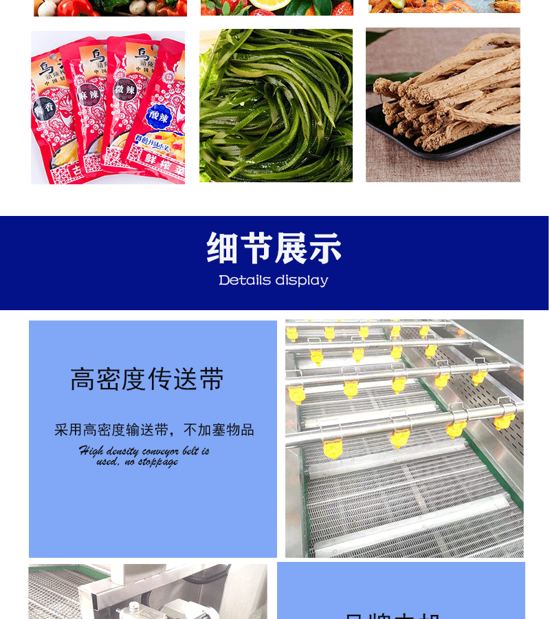 2、本機輸送部分采用SUS304不銹鋼網帶,運行平穩、使用壽命長等特點,符合食品衛生要求。