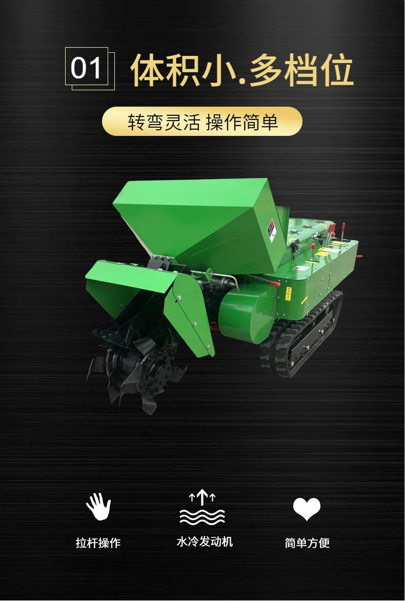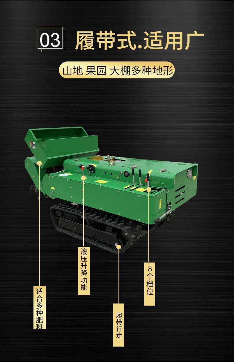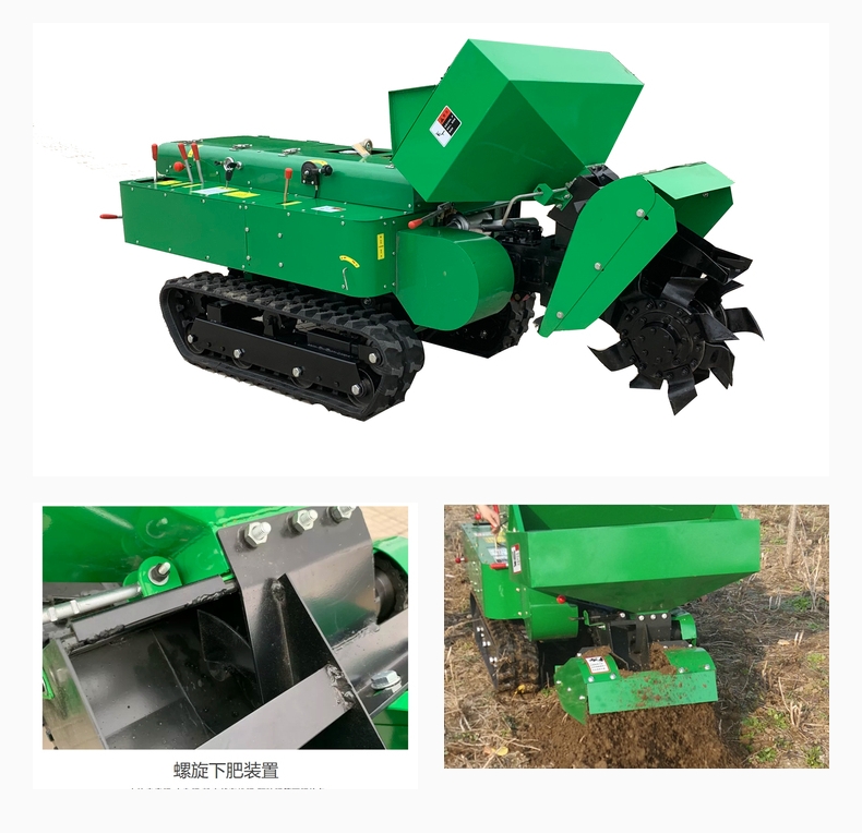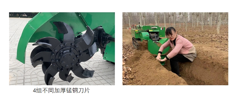 適合各種土質:凍土、硬土、粘土、黑土地,山地,軟土均可使用. 多功能履帶式開溝施肥機可以實現大型機械無法進入的果園、小塊土地、大棚、茶園、丘陵、山地等不同的地形和土質進行作業。