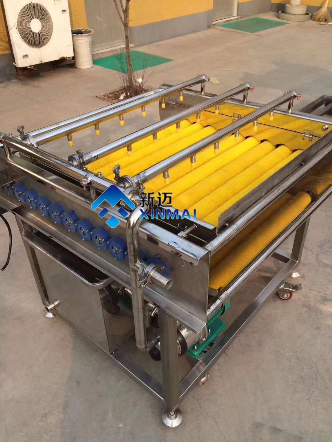 采用不銹鋼SUS304材料制作,符合出口食品衛生要求。毛刷清洗機是我公司設計的一款小型的清洗設備,其占地面積的小,清洗效果好,價格低廉,深受廣大客戶的青睞。主要針對塊狀的產品清洗,比如:土豆,胡蘿卜,山芋,馬鈴薯,紅薯,瑪卡等農副產品,魚類、扇貝、貝殼類。毛輥清洗機整機采用304不銹鋼焊接而成,美觀大方,設計合理,結構簡單,操作更簡單,便于日常維護。設備主要由框架,噴淋管,毛刷,電器,電機等幾部分組合而成。我公司生產的毛刷清洗機毛刷采用高品質,實心輥,具有不掉毛,耐磨,穩定性強等特點。毛輥清洗機配備8-13根毛輥,常用的是9根毛輥。毛刷分為常規跟波浪式兩款。根據產品的特性,配備不同的毛刷款式。毛輥清洗機運轉時,產品跟隨毛輥轉動。360度的旋轉,360度的清洗,在毛刷跟產品滾動的同時,噴淋水對產品進行沖刷,保證產品清洗無死角,有效的去除產品表面及夾縫的污垢達到良好的清洗效果。并且節省水能。毛輥清洗機的雜質排出主要原理是噴淋水的沖刷,通過毛輥的運轉,將清洗下來的雜質轉送到設備的底部,設備底部設計有回收料斗,將雜質進行統一集中排出。清洗效率,為企業降低產品的生產成本。目前常規生產的型號有:1000型,1500型,1800型,三款型號,是我公司吸取了國內外對瓜果加工機械的特點,取其優點設計制作。簡單,耗能低,占地小,效率高是它具有的特點。