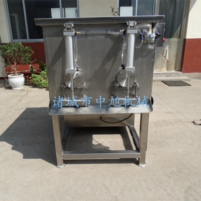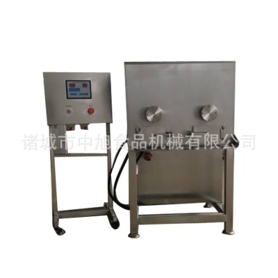 真空拌餡機(jī)是在真空狀態(tài)下,利用物理沖擊原理,讓肉在滾桶內(nèi)上下翻動(dòng),相互撞擊、摔打,達(dá)到按摩、腌漬的作用,使肉均勻的吸收腌漬,提高肉的結(jié)著力及產(chǎn)品的彈性;本機(jī)具有肺呼吸功能,讓產(chǎn)品在攪拌內(nèi)做膨脹、縮小的往復(fù)運(yùn)動(dòng),改善了肉組織的結(jié)構(gòu),提高肉質(zhì)質(zhì)量,增加出品率。可以增強(qiáng)保水性,改善產(chǎn)品的口感和增加產(chǎn)品的柔嫩性和結(jié)構(gòu)穩(wěn)定性。本機(jī)采用兩套氣缸自動(dòng)開(kāi)蓋,只要輕輕摧一摧手動(dòng)閥,氣缸就啟動(dòng)開(kāi)蓋,反之就關(guān),出料也是自動(dòng)出料輕輕催一催另一個(gè)手動(dòng)閥,出料口就自動(dòng)開(kāi),反之就關(guān)。該機(jī)采用數(shù)顯時(shí)間繼電器可根據(jù)用戶的要求,自動(dòng)控制,節(jié)約人工。
