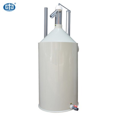 蛋白質分離器是由離心旋流過濾裝置、十字布水裝置、反應室、泡沫收集管、射流進氣組件、底部排空、臭氧加注、出水及工作液位調整等部分組成,具體處理流程為:需要處理的水體在進入離心旋流過濾裝置,在旋流離心力的作用下,大的顆粒物和細小的污物由旋流排污口排出(約進水量15%),經旋流過濾處理后85%水進入十字布水裝置進行均勻布水,布水后水緩慢流入反應室,期間射流器裝置同時工作,吸入空氣,在水氣混合中產生大量微細氣泡。在水、氣、粒三相混合的體系中,不同介質的相表面上都因受力不平衡而存在界面張力,當微氣泡與固體懸浮顆粒接觸時,由于表面張力的作用就會產生表面吸附作用。微氣泡向上運動時,水中的懸浮顆粒和膠質(主要是養殖生物的殘餌及排泄物等到有機物)便附著在微氣泡表面上,造成密度小于水的狀態,利用浮力原理使其隨氣泡向上運動,并聚積在上部水面,隨著微氣泡的不斷產生,聚積的氣泡不斷推積到頂部的收集管中被排出。
