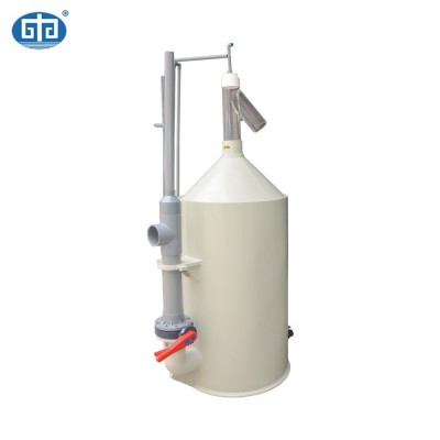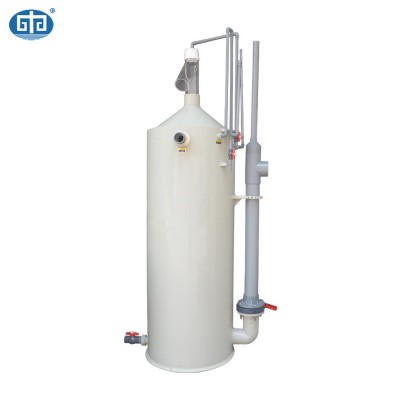 蛋白質分離器是由離心旋流過濾裝置、十字布水裝置、反應室、泡沫收集管、射流進氣組件、底部排空、臭氧加注、出水及工作液位調整等部分組成,具體處理流程為:需要處理的水體在進入離心旋流過濾裝置,在旋流離心力的作用下,大的顆粒物和細小的污物由旋流排污口排出(約進水量15%),經旋流過濾處理后85%水進入十字布水裝置進行均勻布水,布水后水緩慢流入反應室,期間射流器裝置同時工作,吸入空氣,在水氣混合中產生大量微細氣泡。在水、氣、粒三相混合的體系中,不同介質的相表面上都因受力不平衡而存在界面張力,當微氣泡與固體懸浮顆粒接觸時,由于表面張力的作用就會產生表面吸附作用。微氣泡向上運動時,水中的懸浮顆粒和膠質(主要是養殖生物的殘餌及排泄物等到有機物)便附著在微氣泡表面上,造成密度小于水的狀態,利用浮力原理使其隨氣泡向上運動,并聚積在上部水面,隨著微氣泡的不斷產生,聚積的氣泡不斷推積到頂部的收集管中被排出。