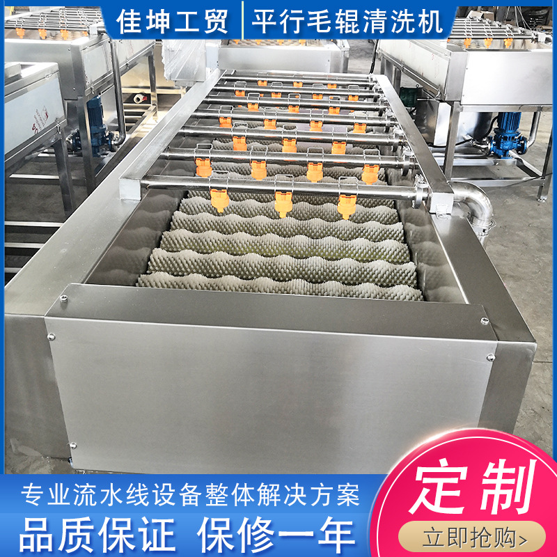 佳坤毛刷清洗機(jī)又稱(chēng)輥刷清洗機(jī),適用于胡蘿卜、土豆等各種根莖類(lèi)蔬菜和柑桔類(lèi)水果以及海鮮肉類(lèi)物料的分揀清洗,(去皮去泥沙去毛等)采用食品級(jí)毛刷輸送和清洗,利用旋轉(zhuǎn)刷配高壓噴淋,清洗效果好,能 清洗果蔬表面的污漬。去皮清洗機(jī)根據(jù)果蔬加工需求設(shè)計(jì)的用于圓形、長(zhǎng)形果蔬的刷洗去皮等工作。適用于胡蘿卜、白蘿卜、土豆、紅薯、蘋(píng)果、桔子、元蔥、山藥、辣根、生姜等根莖類(lèi)物料的清洗、去皮。具有清洗有效容積大、效率高,節(jié)水,可連續(xù)清洗,操作簡(jiǎn)單,使用壽命長(zhǎng)等特點(diǎn),刷輥材料經(jīng)特殊工藝處理,經(jīng)久耐用,耐磨性能好。