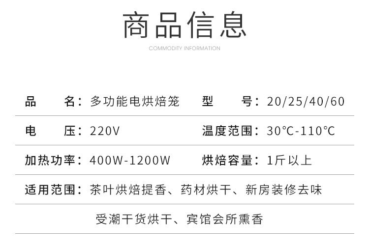 系統默認款式二篩子(鐵絲網篩)需要其他款式篩子,請聯系客服。13599233116 【多功能家用商用提香機】 茶店,茶樓,居家,酒樓好幫手--傳統無碳茶葉電焙籠,可烤綠茶,花茶,鐵觀音,紅茶,大紅袍等各種茶葉 【特點】 1.可降低茶葉含水量,但茶葉仍保侍清香口味,而不含烤火味. 2.烘過的茶葉不會變色. 3.提升茶葉香氣,色澤,口感. 4.延長茶葉保質時間. 5.機身體積小巧,不占空間,重量輕,移動方便,適合各種不同場所. 放在家中,酒店,茶樓,公司,店里等場所烘焙茶葉中,茶香四溢,能吸引顧客聞香上門;現焙現賣,延長茶葉保鮮時間,體現質量對顧客負責。多功能無炭茶葉電烘焙提香機竹編機體回歸傳統碳焙工藝。