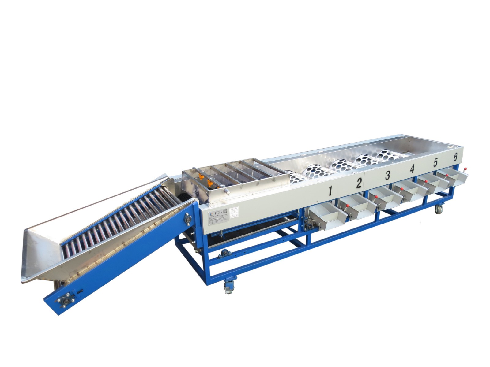 本設(shè)備是由提升機(jī)、清洗分級機(jī)組成。提升機(jī)是自動提升的,通過滾杠自動旋轉(zhuǎn)來達(dá)到均勻上料;清洗分級機(jī)是由5條毛刷和5筒6級組成,分級機(jī)根據(jù)果蔬的直徑大小來分選