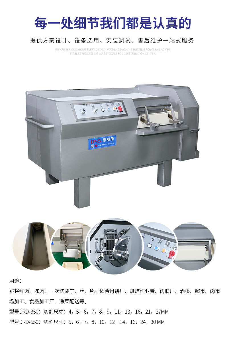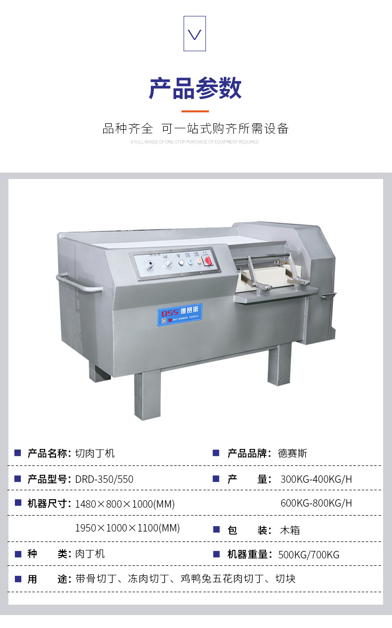 詳細信息 訂貨號DRD-350/350A 加工定制是 貨號DRD-350 550 種類凍肉片切丁機 品牌德賽斯 型號DRD-350/350A 電壓380(V) 功率3(kw) 凈重400(kg) 包裝木箱 外形尺寸1480*800*1000(mm) 產品用途能將鮮肉、凍肉、蔬菜等一次切成丁、絲、片。