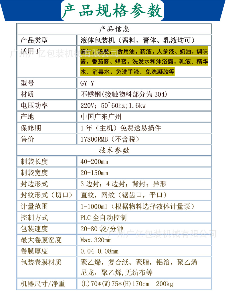 | 功能 | 灌裝,封口,充填,打碼、噴碼,制袋 | 品牌 | GY | 型號 | GY-Y |