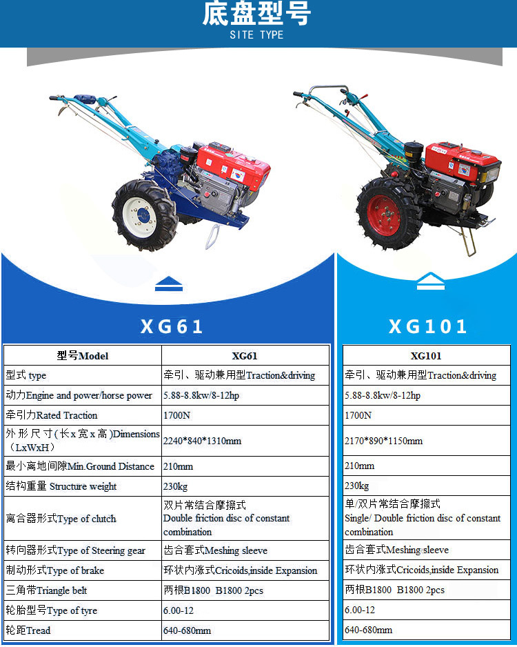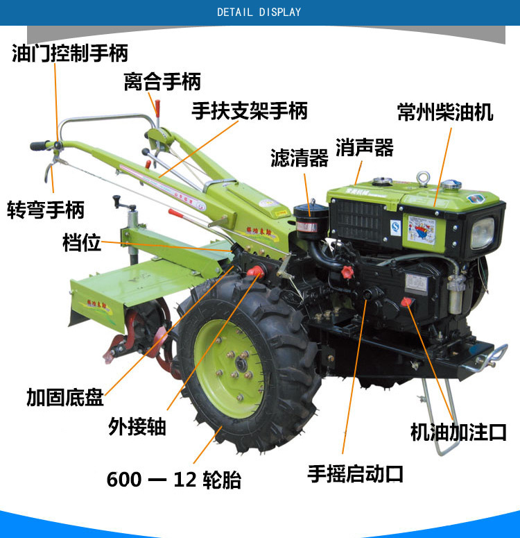 五孔箱體,490加粗軸,半軸長440,王字檔,方把,三槽雙離合器,600-12瑪鋼圈,加長加厚柴油機架。8-25馬力才柴油機可選