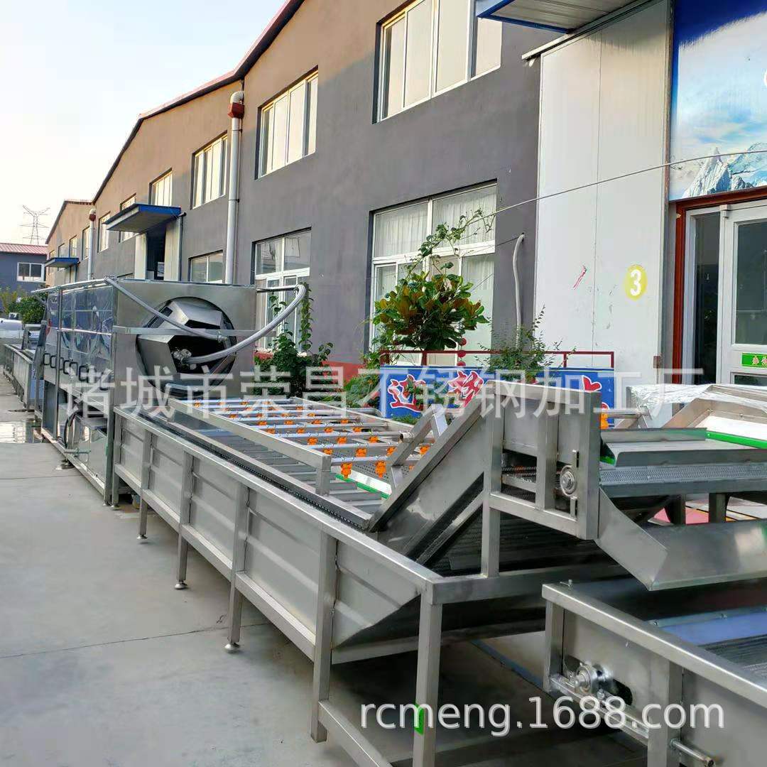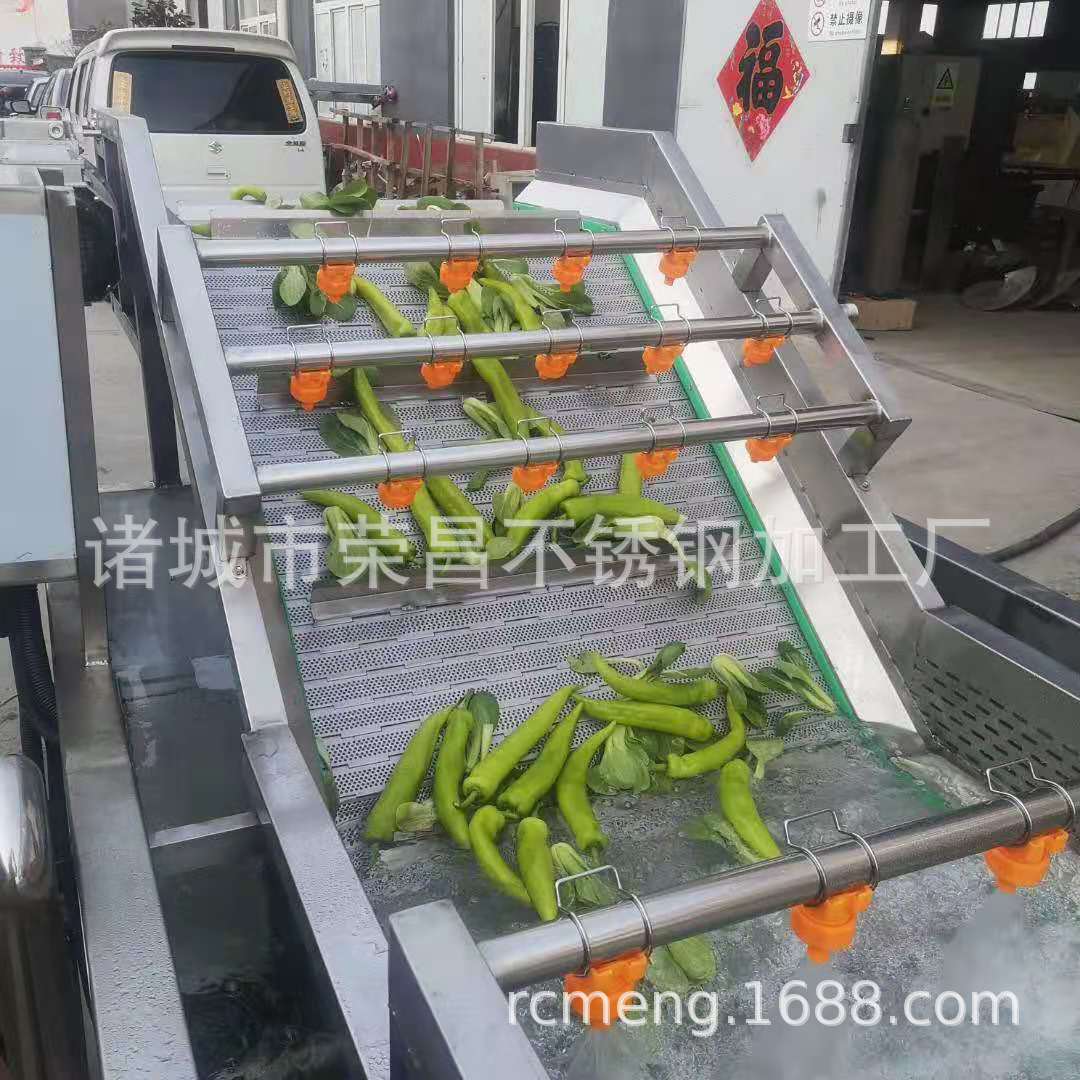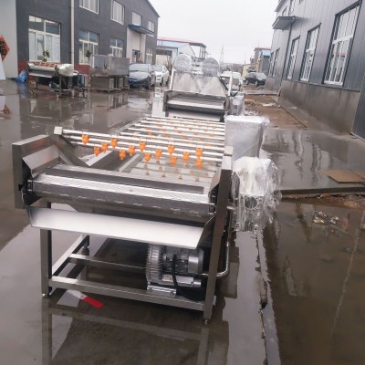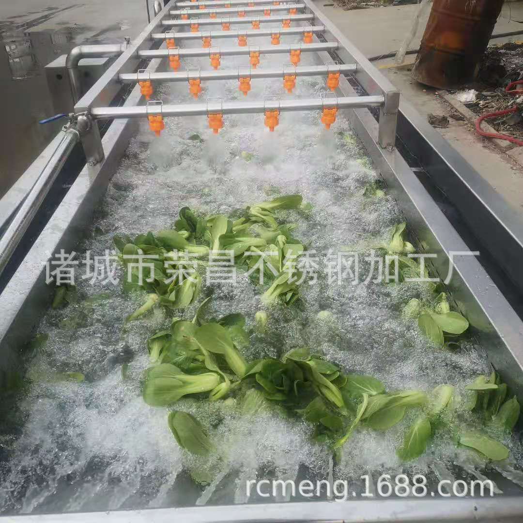 2、該機利用旋渦風泵通過送汽管槽底送氣排管上的小孔,向水槽水中送氣,通過高壓水的射流作用產生大量氣泡及渦流對果蔬進行翻動沖洗,被分離過的泥沙通過隔渣孔板沉入槽底,毛發纖維蟲卵漂浮在水面,被水流推入兩角的隔離板內,以此循環將果蔬洗凈,如兩臺并用,進行粗洗。清洗線,清洗線