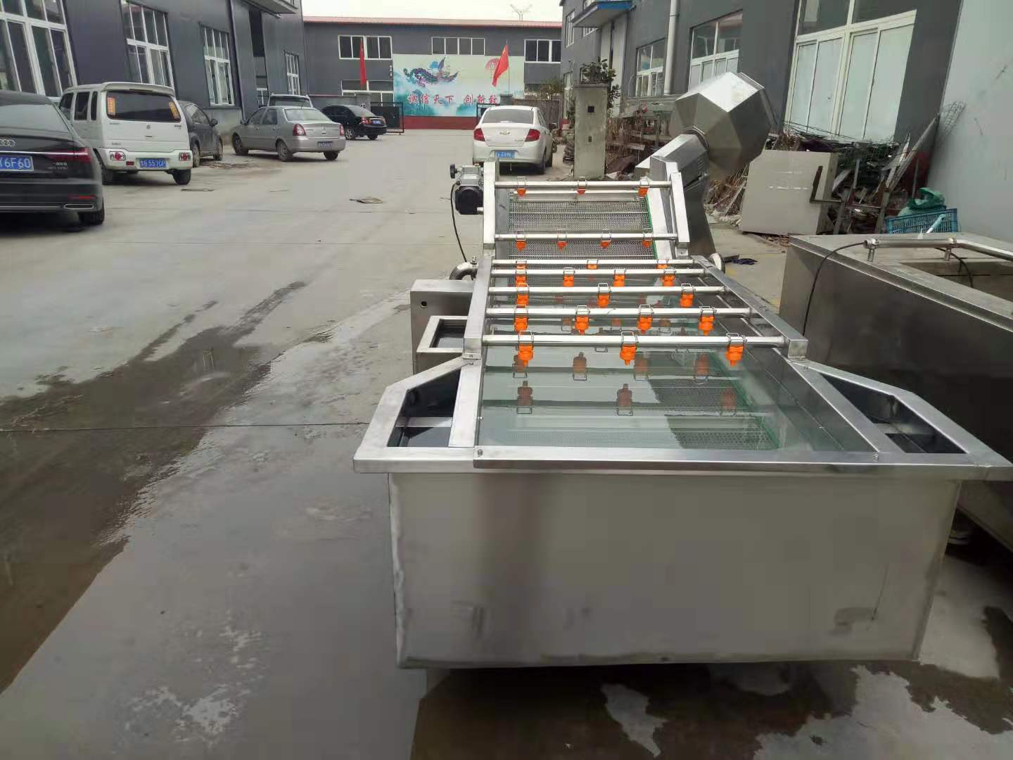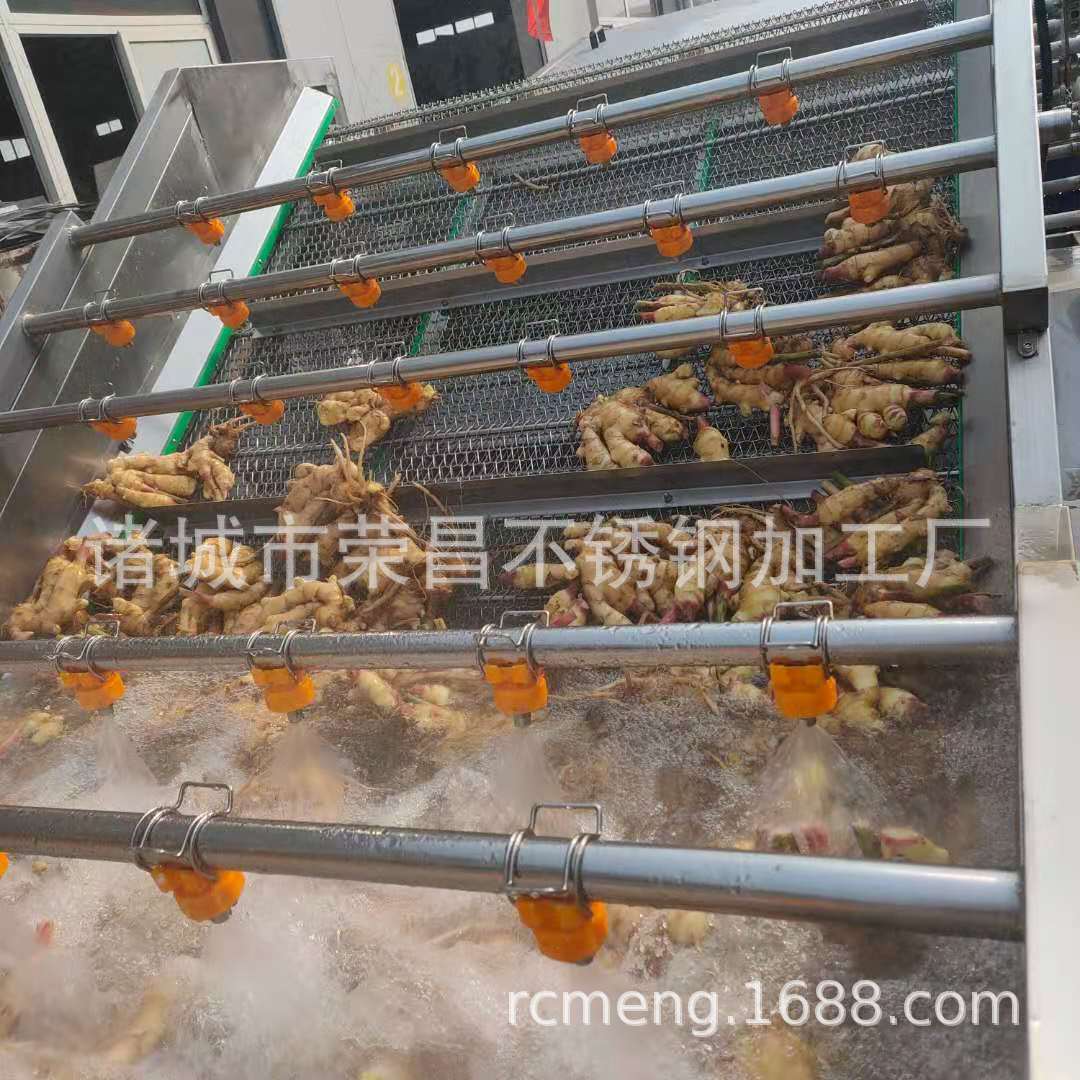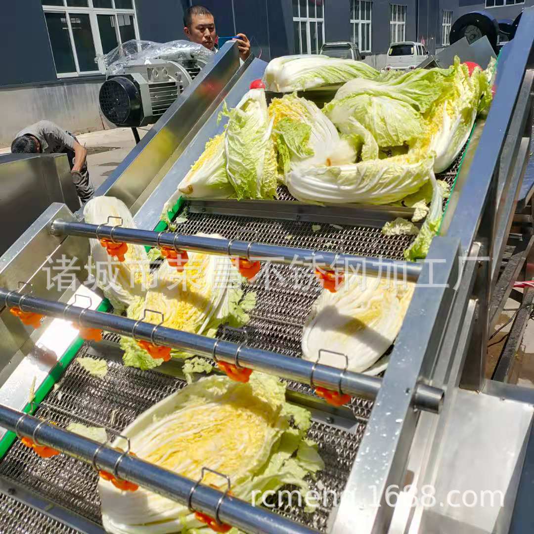2、該機利用旋渦風泵通過送汽管槽底送氣排管上的小孔,向水槽水中送氣,通過高壓水的射流作用產生大量氣泡及渦流對果蔬進行翻動沖洗,被分離過的泥沙通過隔渣孔板沉入槽底,毛發纖維蟲卵漂浮在水面,被水流推入兩角的隔離板內,以此循環將果蔬洗凈,如兩臺并用,進行粗洗。清洗線,清洗線