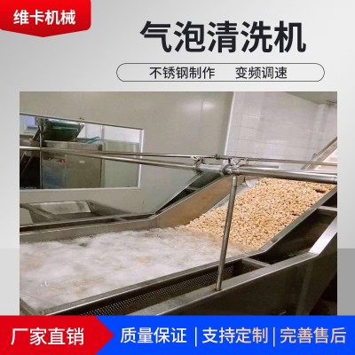 一段:氣泡發生清洗段,特設的布氣方式,產生豐富的氣泡,使物料呈翻滾狀態,保證產品多面清洗,去除產品表面污垢、農殘功效,同時根據需要可加入適量的藥劑,進行消毒固色,漂浮物可以從溢流槽溢出,沉淀物從排污口排出,以達到清洗的目的;