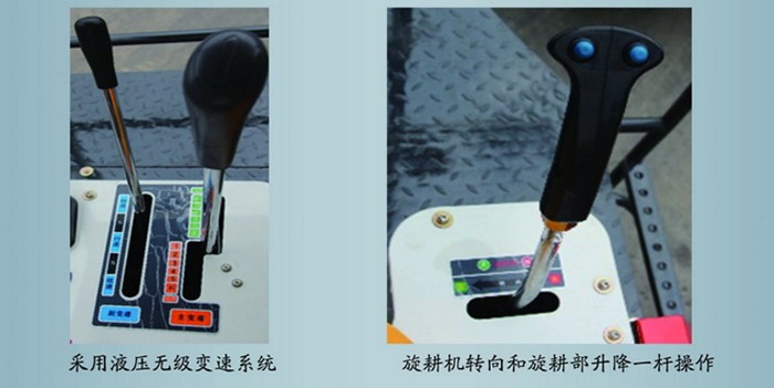 一桿操縱,旋耕部升、降,機器左、右轉向一桿完成,操縱輕松自如