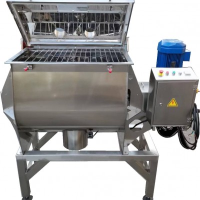 1、該機型為臥式筒體,單軸雙螺帶對稱分布結構。混合機筒體為U型,在頂蓋或筒體上部有進料口,根據用戶需要其上可裝噴霧加液裝置。筒體內裝有單軸轉子,轉子是由軸、橫撐及螺帶組成。