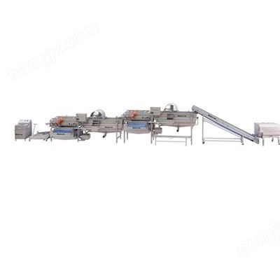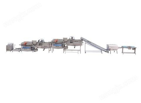 葉菜前期處理的生產線設備(主要包括:六工位挑揀輸送機、切菜機、快裝皮帶提升機、水流式清洗機、振動去雜機、二次水流式清洗機、二次振動去雜機、出料輸送甩干),適用于多種凈菜的清洗及消毒處理。前道工序將原料輸送至切菜機,通過切菜機完成物料加工工序,進入皮帶提升機,由提升機將產品輸送至水流式清洗機進行清洗(360度清洗,延長清洗路徑),水流將產品帶至振動瀝水機進行瀝水及去渣后,進入二次水流式清洗機利用冷水進行清洗(注:0-5度冷水可保證產品的質量、成色、口味及 儲存周期長等特點),水流將產品帶至二次振動瀝水機進行瀝水及去渣后,由出料輸送輸出(可裝箱令藏或進入下道加工工序)。通過上述加工從而保證食品加工工藝的要求完成果蔬前期處理。