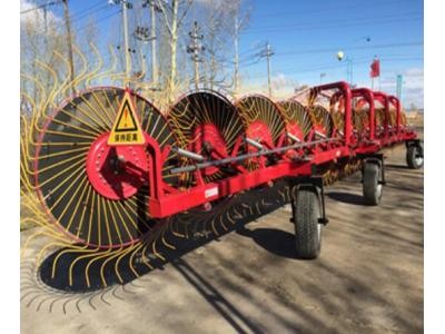 該機具與35馬力以上的拖拉機配套使用,適合于地勢平坦的地況上作業,對割倒晾曬后的牧草、苜蓿、小麥、大麥等作物秸稈進行摟集或翻曬作業。該機具主要由牽引梁總成、指盤總成、前后行走輪總成、主梁、液壓系統、U型梁、滑桿總成等部件組成,其結構合理、性能穩定,工作幅寬,有效提高 工作效率,摟集的草條寬度均勻,有利于捆草機撿拾作業,摟草損失率低,可以將草條翻轉過來或將多個草條合并成一個草條。