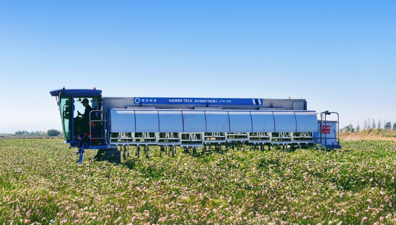 棉花智能打頂機器人VTM-09B專為棉花種植打頂場景下打造的農業機器人,配備傳感器和機器視覺 系統,能夠精準識別棉花頂芽,模仿人工打頂操作,實現高效、精準的作業。借助農藝大模型與實時環境 感知技術,動態調整打頂策略,即便在夜間也能持續作業,有效緩解了農忙期勞動力短缺的問題。