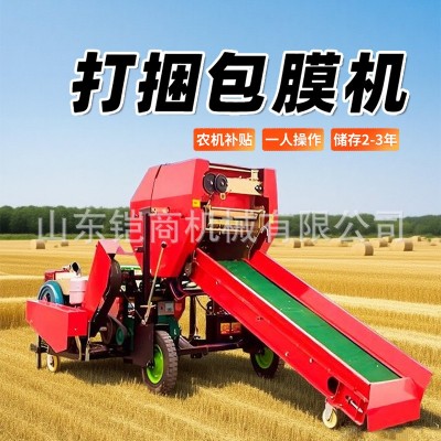 青儲打包機農場秸稈粉碎草料打捆包膜機全自動青貯打捆包膜一體機