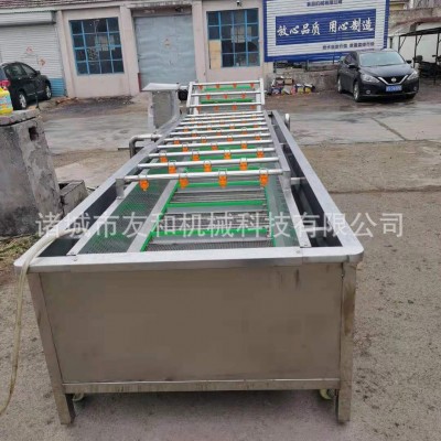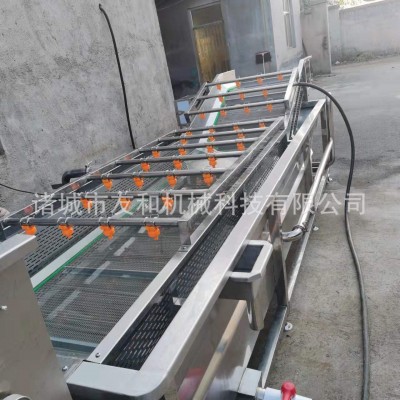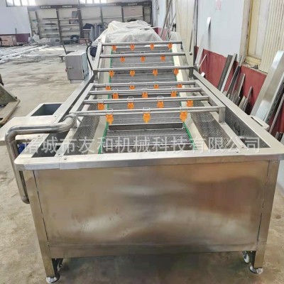 該機(jī)由機(jī)架、水箱、風(fēng)機(jī)(水泵)、循環(huán)沖洗水泵、傳動(dòng)部分等幾部分組成,工作時(shí)由于水中風(fēng)力(壓力)的存在,果蔬在水中劇烈翻滾攪動(dòng),清洗水經(jīng)過(guò)過(guò)濾后,由循環(huán)沖洗泵加壓至進(jìn)料口噴管回沖,噴管方向可調(diào),物料被噴管?chē)姵龅母邏核靡栽俅螞_洗,并朝著出水口方向漂移,出口處置至刮板提升機(jī),刮板提升機(jī)的速度可調(diào)(調(diào)節(jié)刮板提升機(jī)速度到所需的生產(chǎn)能力),將沖來(lái)的果蔬送至下道工序(可根據(jù)用戶要求在出口刮板提升機(jī)上加噴淋管,進(jìn)一步進(jìn)行噴洗)。也可根據(jù)用戶不同的物料,加工不同的提升結(jié)構(gòu)。
