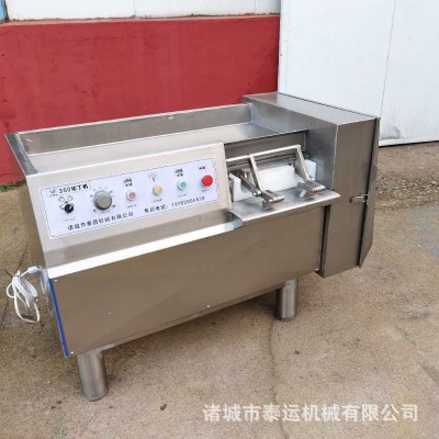 切丁機是肉類制品生產制作工藝中的一個重要設備。將肉塊,脂肪等主要原料,切割成用戶所需要的肉丁,調整刀柵的尺寸可切出肉絲,肉片,肉丁。肉丁尺寸的大小由刀柵中刀片數量來決定。本公司生產的350和550型切丁機適用于大,中,小型肉類食品加工廠,也可以根據客戶提出的要求,定制生產特殊工藝要求的產品。