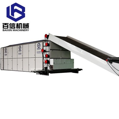 工作原理:將秸稈放置到輸送帶上,經(jīng)輸送帶上的均料裝置后,平鋪到烘干機(jī)網(wǎng)帶上,秸稈在烘干機(jī)內(nèi)由第一層逐一過渡到下一層,每層之間設(shè)置有導(dǎo)料和反轉(zhuǎn)裝置,使秸稈充分與載熱體接觸;秸稈從最后一層流出。載熱體由風(fēng)機(jī)引入到烘干機(jī)內(nèi)部,引風(fēng)機(jī)產(chǎn)生的風(fēng)速、風(fēng)壓使載熱體充分、均勻的散布在烘干機(jī)底部,由于下部壓力大于上面壓力,載熱體向上運(yùn)動(dòng),穿過每層網(wǎng)帶,使物料與載熱體充分接觸,提高烘干效率。